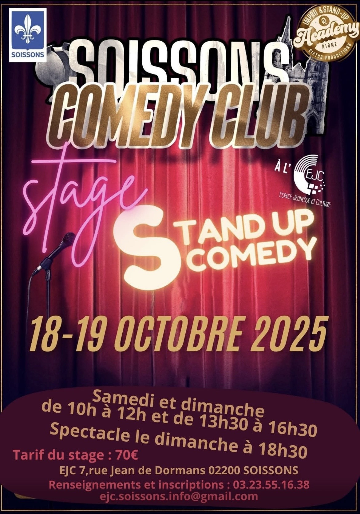 Les 18 et 19 octobre 2025, l’Espace Jeunesse et Culture (EJC) de Soissons accueillera le Soissons Comedy Club, un week-end entièrement dédié au stand-up et à l’humour. Cet événement est une occasion unique pour les amateurs de rire, qu’ils soient débutants ou confirmés, de s’immerger dans l’univers du stand-up et de découvrir ses techniques.